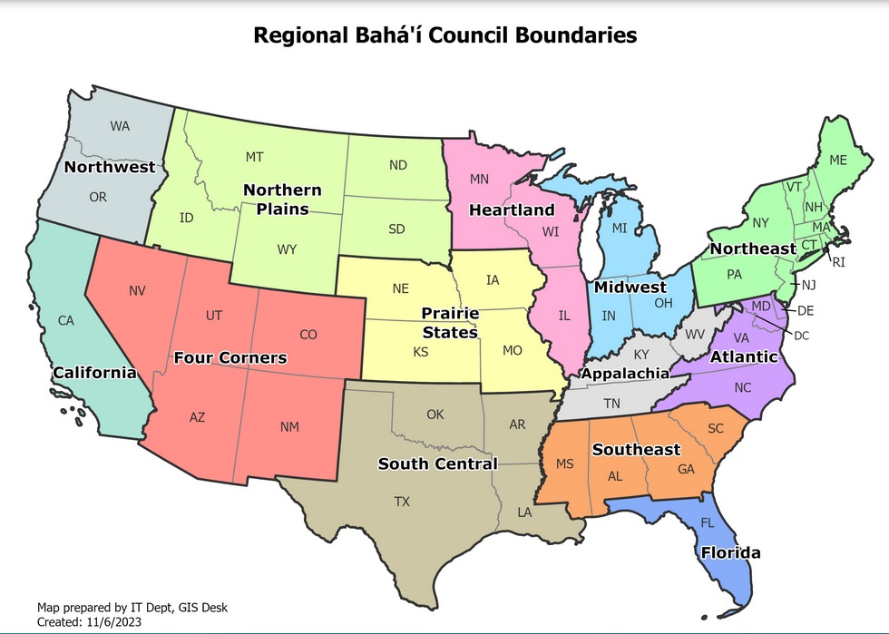 Map showing the regions for all the Regional Baha’i Councils in the U.S.
